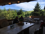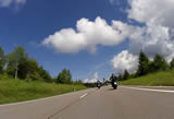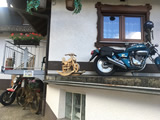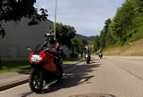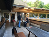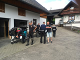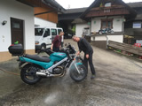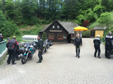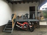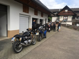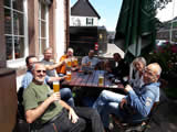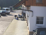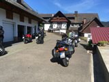 Während die Anderen sich am Sonntagmorgen um 8.00 Uhr am Verteilerkreis Süd in Köln trafen, machten Marcel und ich uns gegen 10.30 Uhr mit unserem Gespann auf den Weg und trafen nach einer Staufreien 400 km langen Autobahn-Anfahrt gegen 16.00 Uhr auf dem Ferienhof Breig ein, wo wir von Gabriele, der Wirtin empfangen wurden. Wir bekamen den Schlüssel für ein schönes Zimmer mit einer kleinen Stahlterrasse und direktem Zugang zum Hof. Wir luden erst mal unser Gepäck aus, danach die Motorräder ab. Der nächste Weg führte uns hinunter an die Bar. Das Erste Bier wurde auf der "Sonnenterrasse" genossen. |