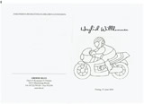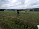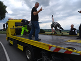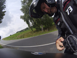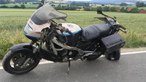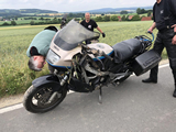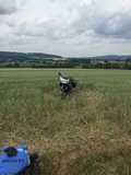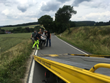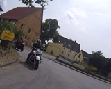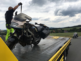 An einer Kreuzung auf halber Strecke zurück, warteten Holly und Engelbert auf mich. Engelbert stellte sich an die Einmündung wohin wir zurück mussten, damit die Anderen uns finden konnten. Holly und wir fuhren weiter zurück. Als wir am Unfallort eintrafen, waren Stefan und Marcel bei Nase und hatten sein Motorrad schon wieder hingestellt. Mit vereinten Kräften holten wir den Bock aus dem Acker, damit der von Holly gerufene ADAC-Abschleppwagen es einfacher haben würde ihn zu verladen. Inzwischen hatte Michael auch gegen den Willen von Nase (O-Ton: "mir tut nur der Hintern weh"!) einen Rettungswagen angefordert. Sein Helm sah jedenfalls so aus als wäre auch der Kopf in Mitleidenschaft gezogen worden. |